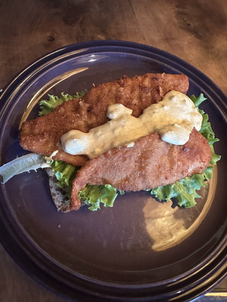 Smörrebröd med friterad fisk och curryremoulad. Allt gjort av minstingen.