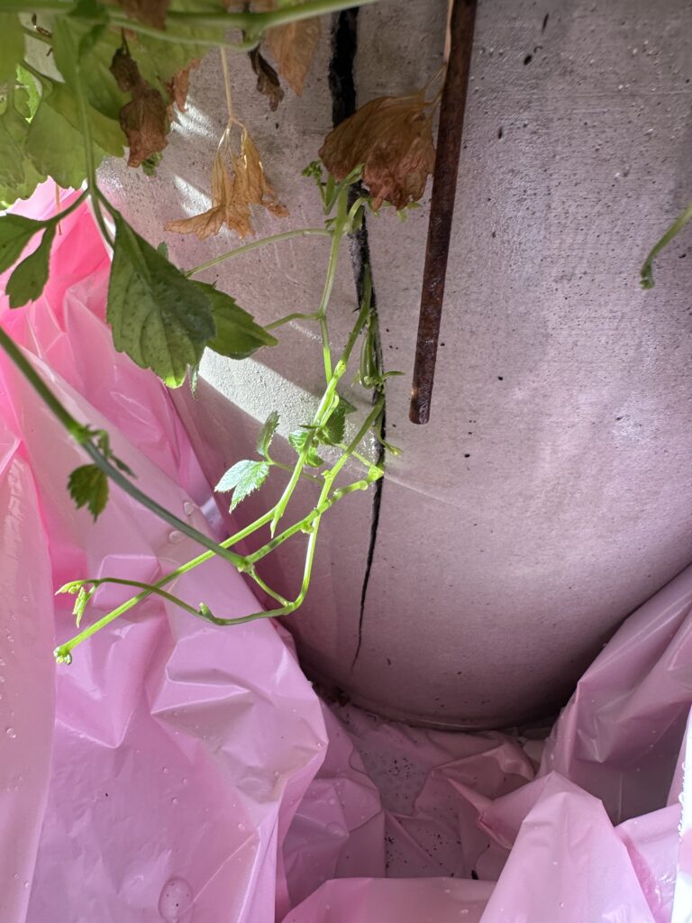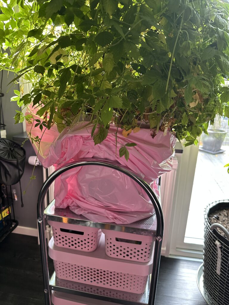 Det är svårt att vara kreativ när hjärnan är bortkopplad. Vilket också är anledningen till att jag inte sett sprickan innan den blev så stor. I brist på kreativitet så får det bli nödlösning. Rosa sopsäck runt alltihopa och så får jag byta kruka när jag har ork.