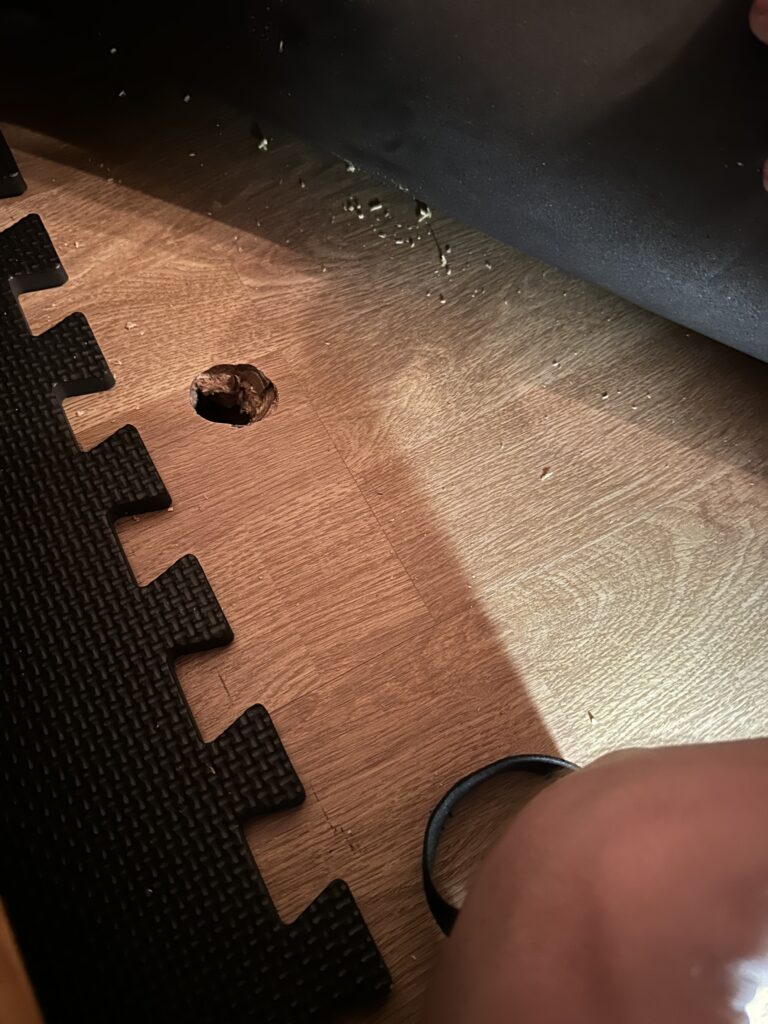 Jag kan meddela att den drar i backen och gör ett fint runt hål, rakt igenom gymmatta, laminatgolv, spånskiva och allt annat ner till kutterspånet. Det kan jag meddela.