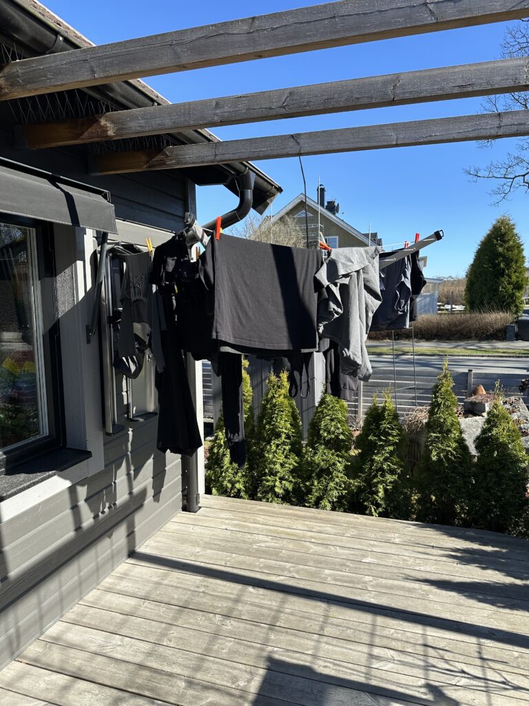 Det är ännu lite kallt så det blev en maskin som hängdes ute. Kläderna behöver hänga med mellanrum av linorna samt att torktiden bara räcker till en omgång. Att det är värt det lilla extra är en underdrift. Ser fram emot tvättat golv och allt annat dammigt så tvätten håller sig ren när den torkar.