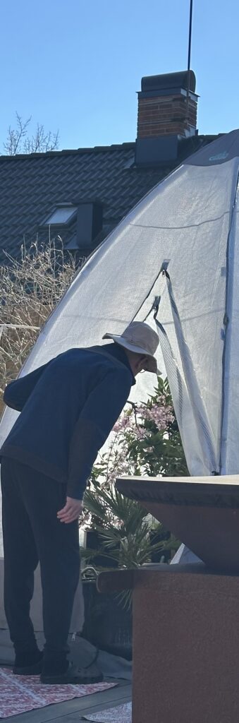 Efter blev det tid med maken på altanen. Jag gullade lite med persikoträden i tältet. Jag hoppas och tror att det går bra med mig som bi med hjälp av en pensel på en bambupinne. Maken såg en humla som han hoppades på skulle hitta in till blommorna i tältet. Det gjorde den nog inte.