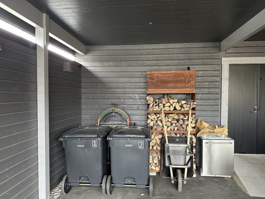 Jag funderar på om bägge ska stå under carporten. I nu läget har vi ändå behövt köra ut tunnan till tomtgränsen. Det behövdes inte tidigare så vår tunna har stått cirka fem meter in på tomten. Därför tänker jag att det kan stå under carporten.