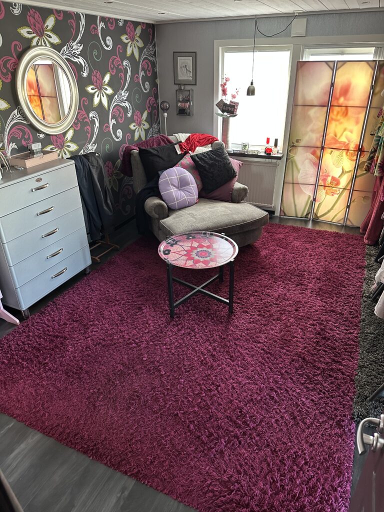 Där jag sätter på mig mina smycken har vi en stor, alldeles underbar, ryamatta. Den är mycket skön att gå på. Den dämpar ljud. Den har fin färg och livar upp garderoben.