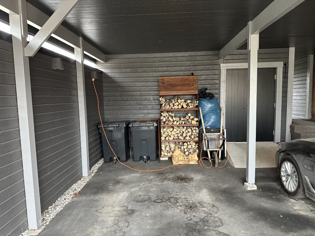 Men när man kommer in i carporten så syns allt mycket tydligt. Det viktigaste är väl ändå att vi har soptunnor. Än så länge tycker jag det är väldigt skönt att ha närsortering, som det kallas. Vi har dock inte löst det inne än. Men det kommer. Just nu så läggs kartong och plast på bänken medan man roddar i köket. När allt är klart så går man direkt ut med kartong och plast.